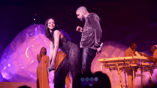 Dressed in an edgy black shift dress and glitzy rainbow heels, Rihanna and Drake headed out in London for the second night—this time, arriving together at Tramps nightclub. Once again, the two didn't leave until the wee hours of the morning at approximately 4:30 a.m.. Earlier that evening while on-stage during Rihanna's concert, Drake said to the audience, "Shout out to the most beautiful, talented woman I've ever seen. She goes by the name of Rihanna… I'm getting my heart broken." He then wrapped the Barbadian beauty up in a hug and kissed her cheek. 💔💔💔